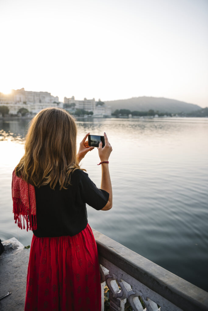 Western woman capturing the view of Udaipur city, India